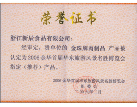 金珠牌肉制品產(chǎn)品被認(rèn)定為2006金華首屆華東旅游風(fēng)景名勝博覽會指定(推薦)產(chǎn)品。