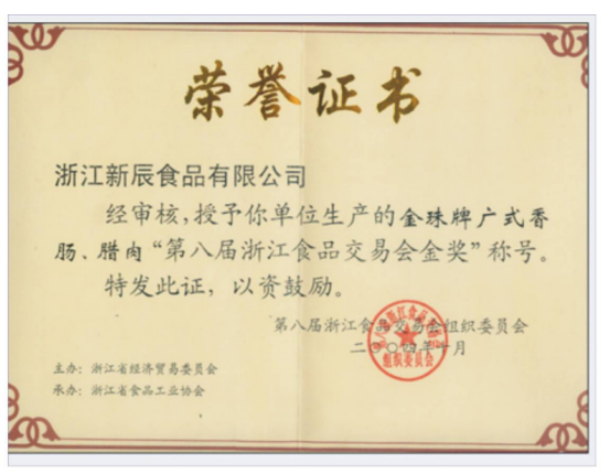金珠牌廣式香腸、臘肉“第八屆浙江食品交易會金獎(jiǎng)”稱號