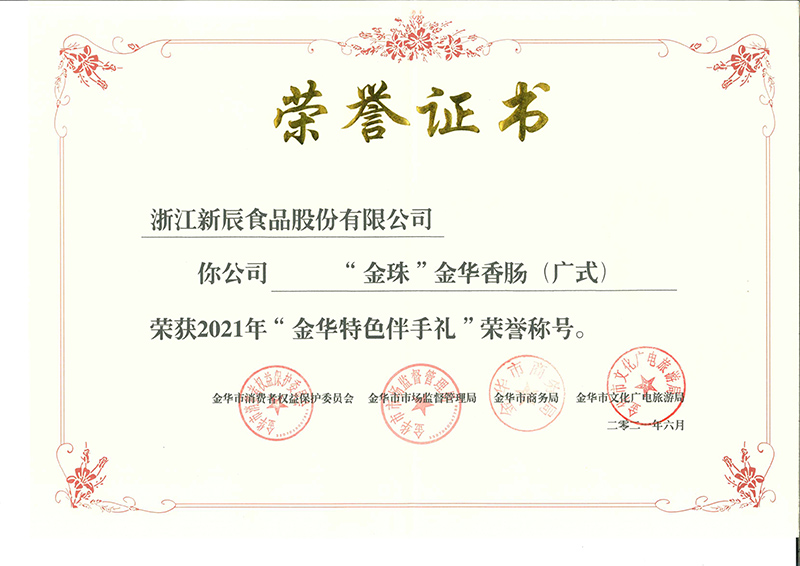 “金珠”金華香腸(廣式)榮獲2021年“金華特色伴手禮”榮譽(yù)稱號。